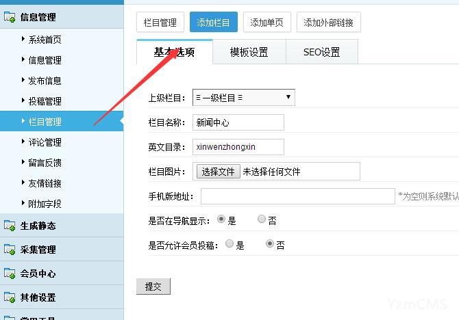 點(diǎn)擊左側(cè)菜單欄,選擇欄目管理->添加欄目