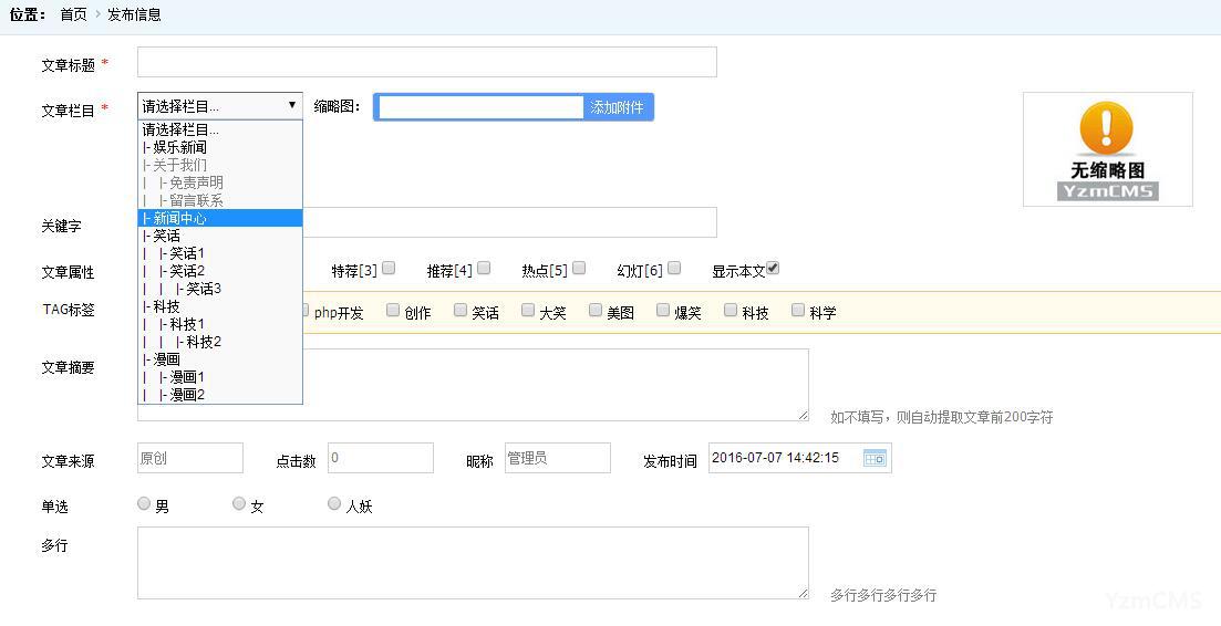 選擇左側(cè)菜單->發(fā)布信息 ,就可以看到我們剛才添加的欄目了,選擇欄目,即可發(fā)布文章~