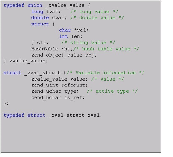 Zval是zend中另一個非常重要的數據結構,用來標識并實現PHP變量,其數據結構如下: