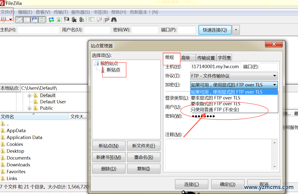 以FileZilla軟件為例,客戶在管理站點的時候,加密選擇為 只使用普通FTP(不安全) ,如下圖所示,保存站點信息之后,再次連接虛擬主機服務器,測試即可成功。